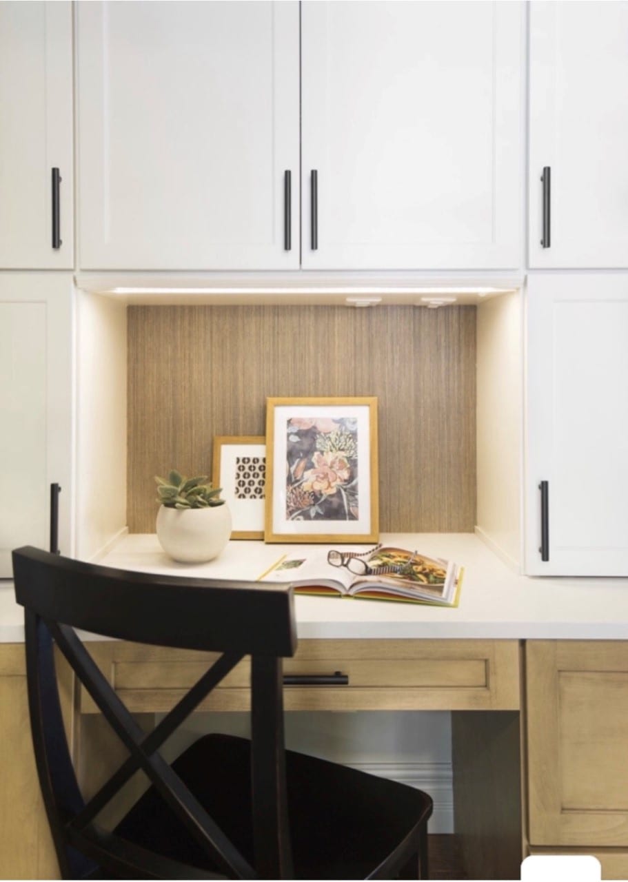In the end we gave our clients a beautiful and highly functional design that will last a lifetime. We made the most of the space by utilizing the ceiling height and designing counter to ceiling custom cabinets. The base cabinet to the left houses the printer, and the base cabinet to the right contains two file drawers. The central opening has the perfect amount of space for our client to write or to use her laptop. And as promised, there is plenty of task lighting with puck lights in both of the side cabinets, and a strip light in the middle section. Finally, our homeowner added her own personal touch by applying some leftover grass cloth wallpaper to the exposed wall. We think the result is really special.