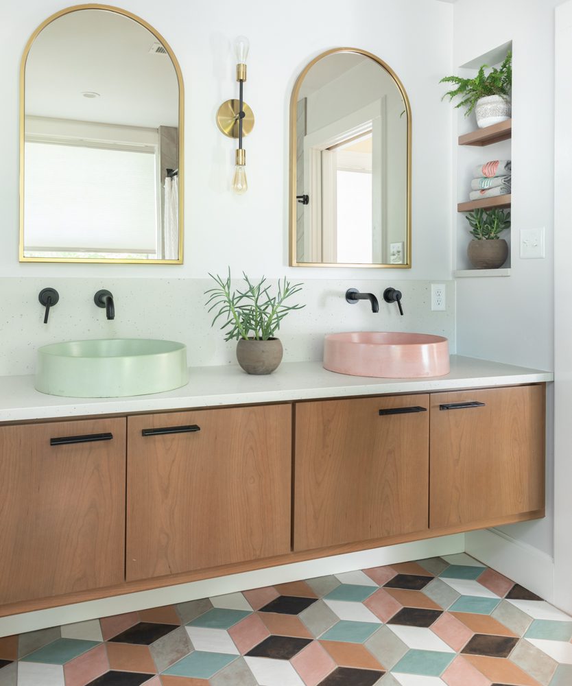 A colorful room doesn’t have to be overwhelming. Pair bold shades with soft neutrals like whites, beiges, and warm woods to create a harmonious look that feels both fresh and timeless. We love to use light wood tones in the cabinetry, while saturating the trim in bold color. We also love to keep walls neutral, then pop a colorful vanity or fun tile into a space. There is no right or wrong way to go. Both are a great way to add color.