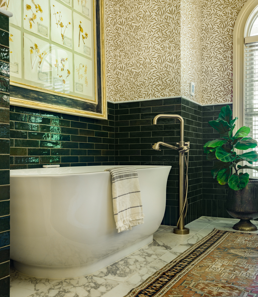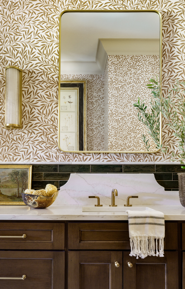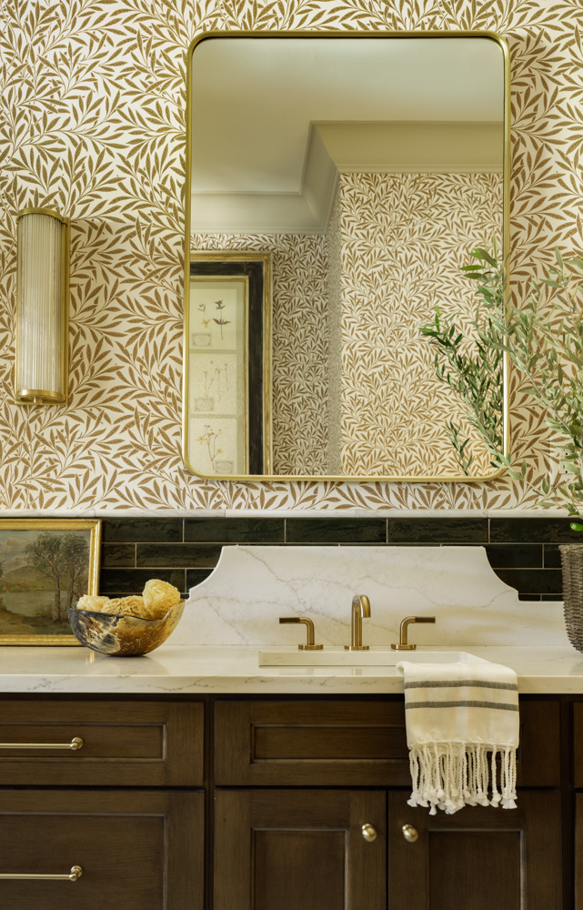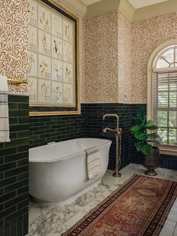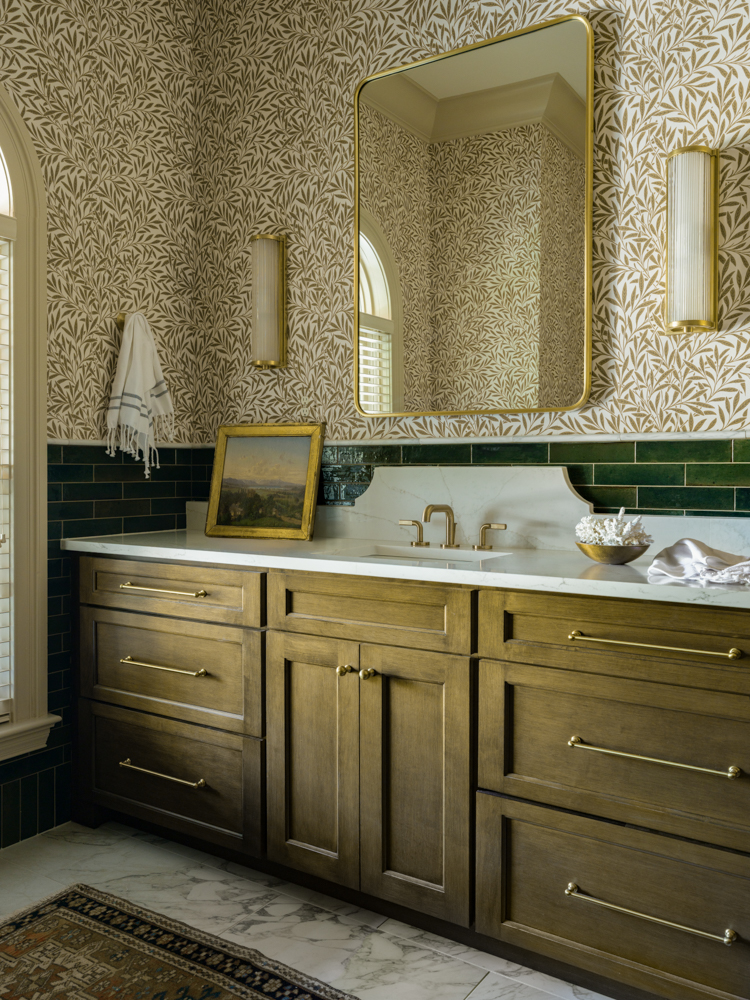To elevate the space, we introduced dramatic patterned wallpaper paired with deep green wall tile, bringing warmth, depth, and visual contrast. A tailored vanity design and warm brass plumbing fixtures add a refined, classic feel while balancing the bold materials throughout the room.
