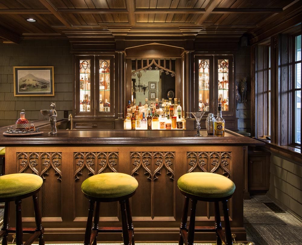 The beam ceiling was created from a dying white oak that stood in the front yard for 180 years, long before the historic home was built. Leaded glass gothic arches in the doors and backlit stained glass in the ceiling speak historically. Churches erected hundreds of years ago inspired the intricate details. The brass sconces are very old and the drop down TV is very new. The counter top, bent sheets of brass, crafted by the artist himself is continually polished to a bright shine. Even the bar stools had to be searched for for months then modified to perfectly fit the vision. The floor is marble, heated to stave off the cold from the crawl space below. I could go on, the details are without end, This was written by the dreamer’s proud wife, who, turns out found a way to fill the page after all.