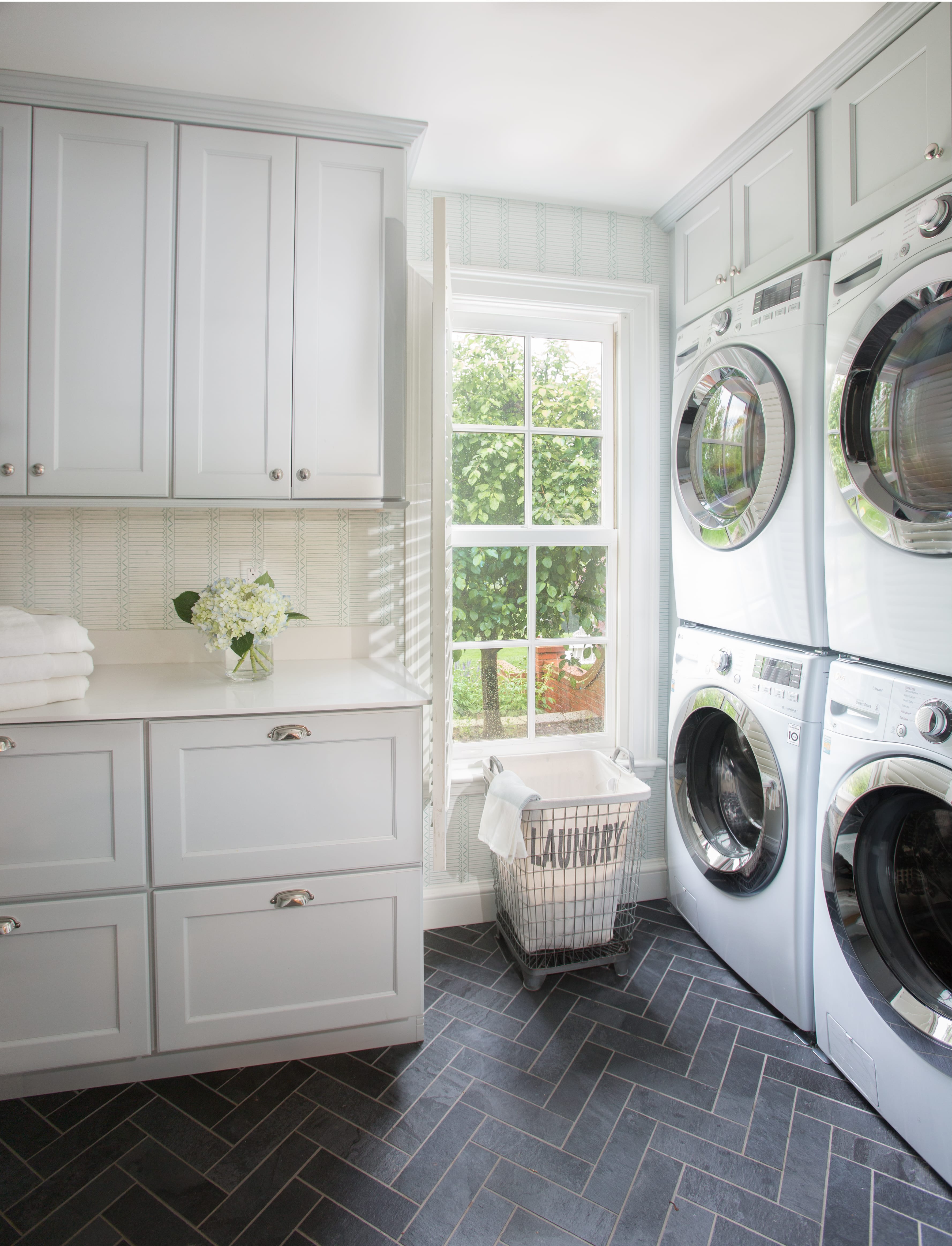 - The herringbone tile floor is perfect in the laundry room.