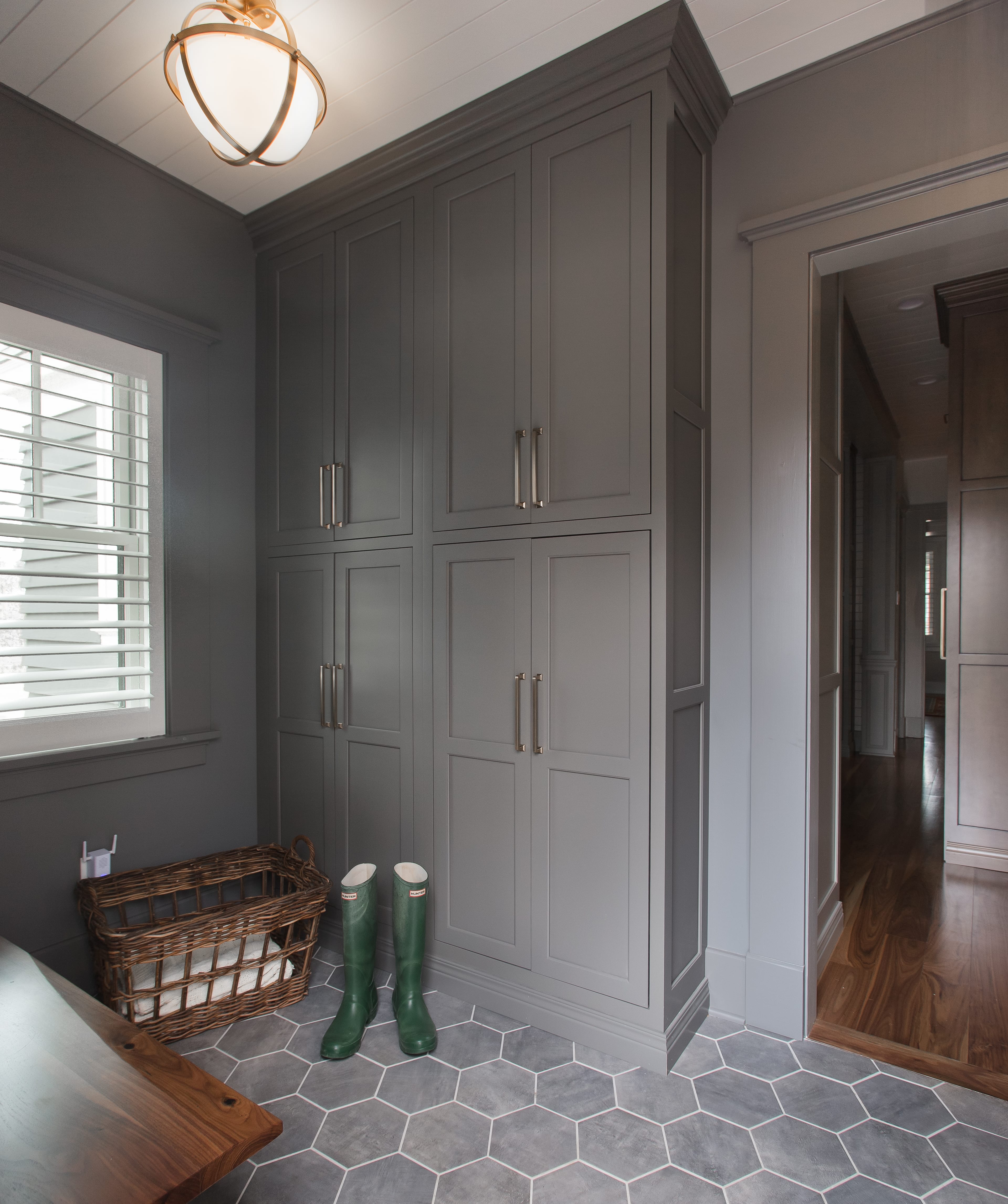 - A dark patterned tile for the mudroom hides dirt and is durable.