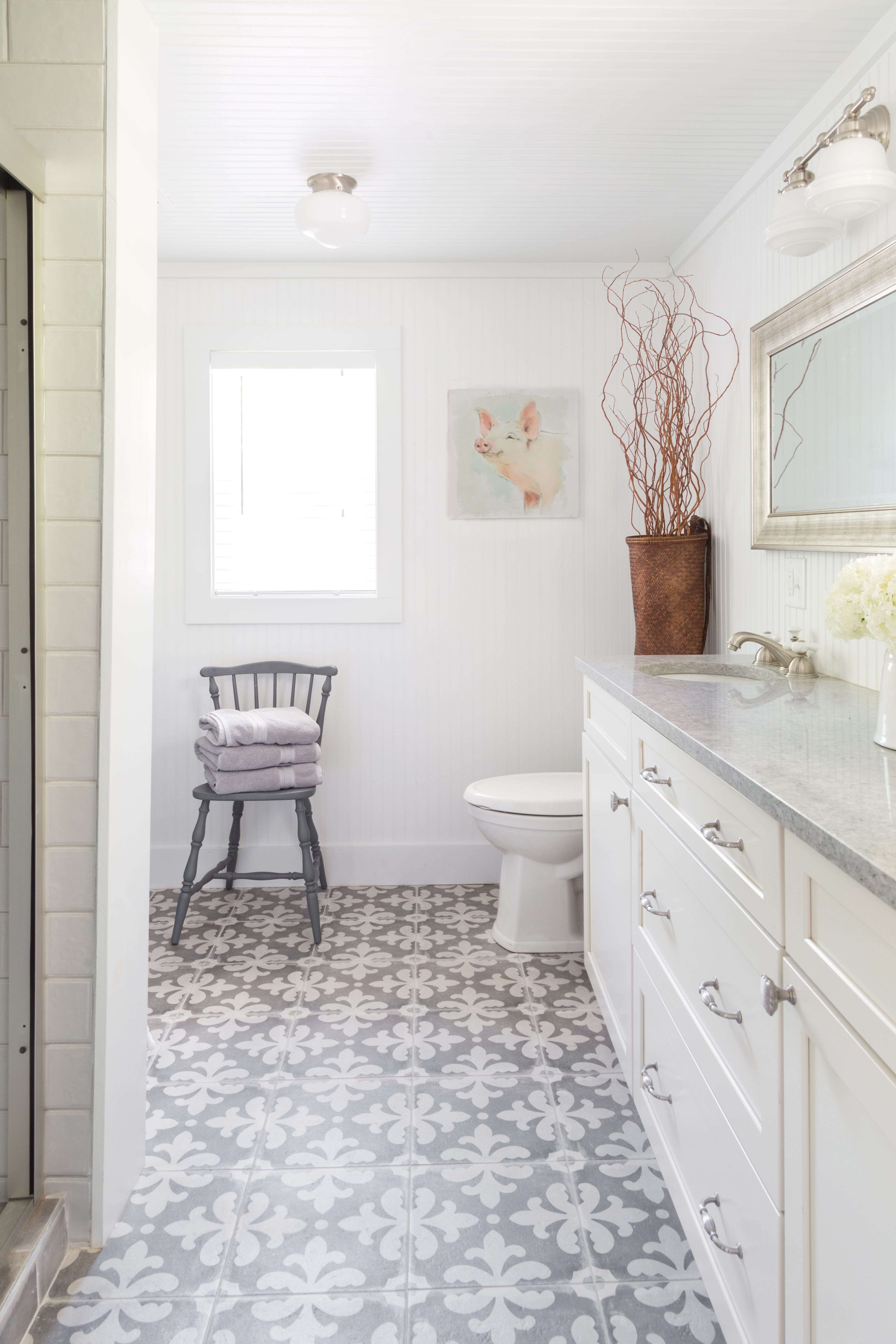 - Grey and white tile adds interest to this floor.