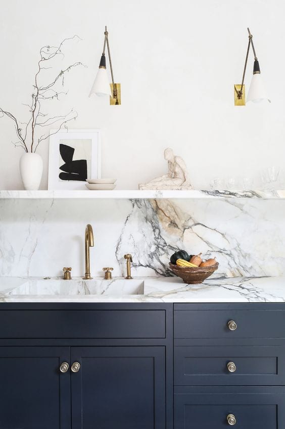 Lastly, the final trend that we are going to mention is solid natural stone. In this case, we are speaking about the backsplash. By using solid natural stone, you create one seamless line. Hence, the overall aesthetic is sleek and clean. Be aware that this is going to cost more than stone tiles, and depending on the size or your space may require multiple slabs of stone. Nonetheless, solid natural stone is a great choice because you can find it in every color and pattern imaginable. From solid white marble to multi-colored granite, there is something for every taste and style. Here are some examples of how solid stone can be used to totally transform your design.